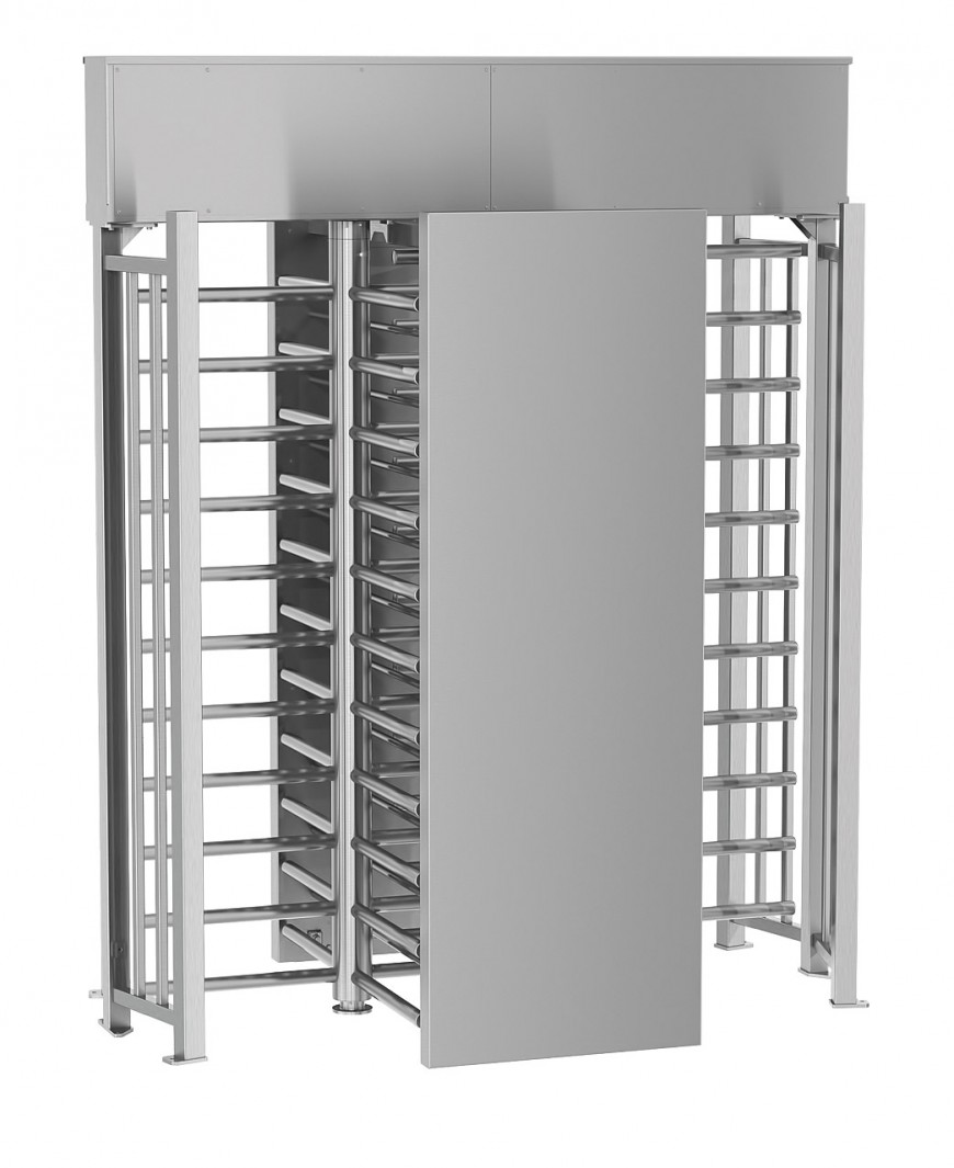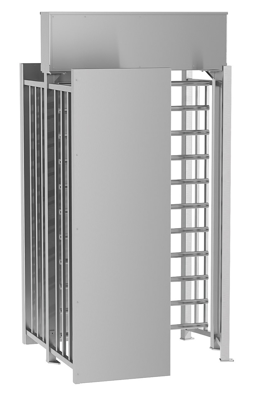 - Full-height motorized turnstile with entry / exit side panels, bi-directional passage mode